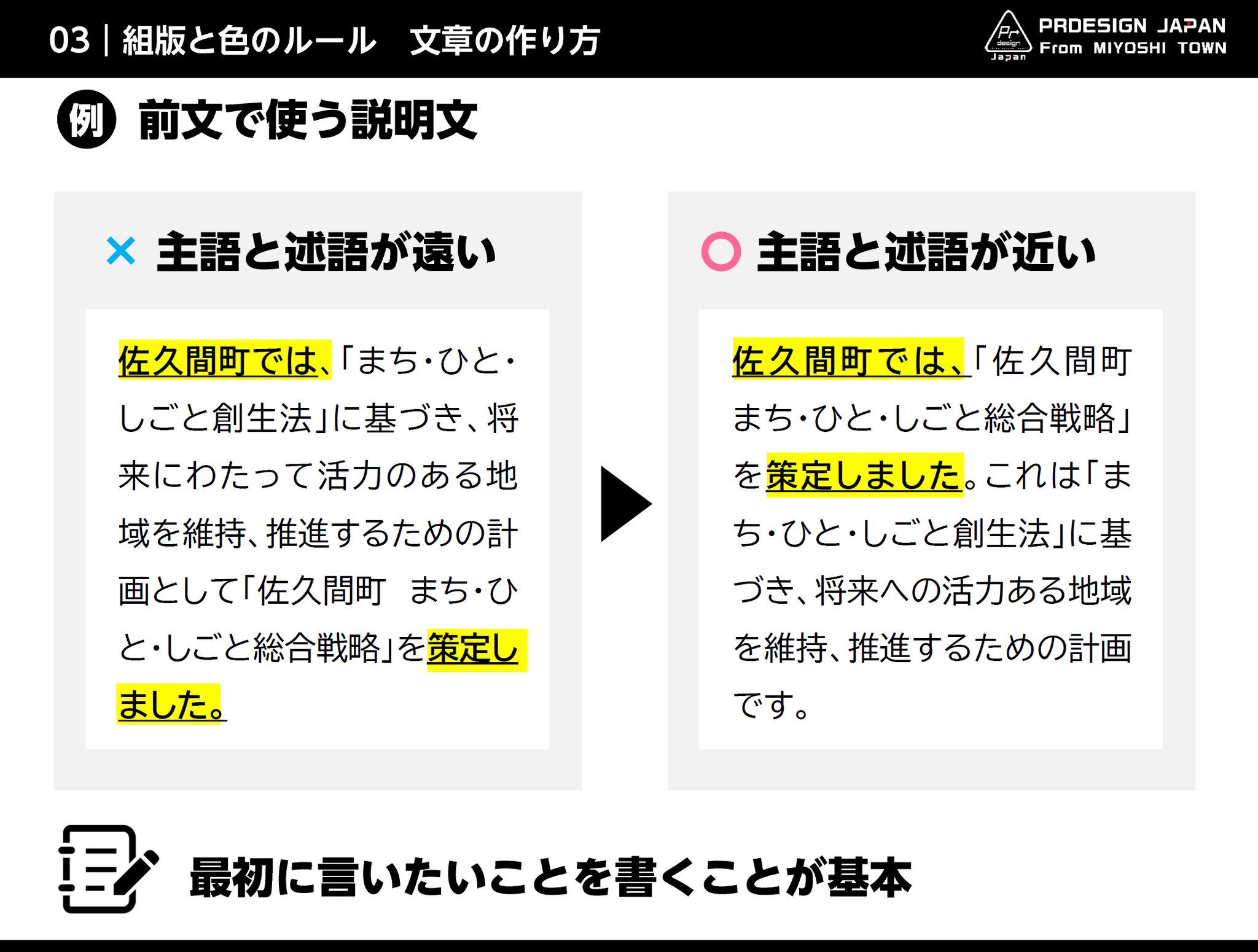 佐久間智之 公務員は頭に入ってこない文章を書きがちです その原因の一つは主語と述語 の距離が遠いから 言い訳がましい印象にもなってしまうので注意が必要 改善策として主語と述語を近づける方法があります グッと分かりやすく伝わる文章になりますので